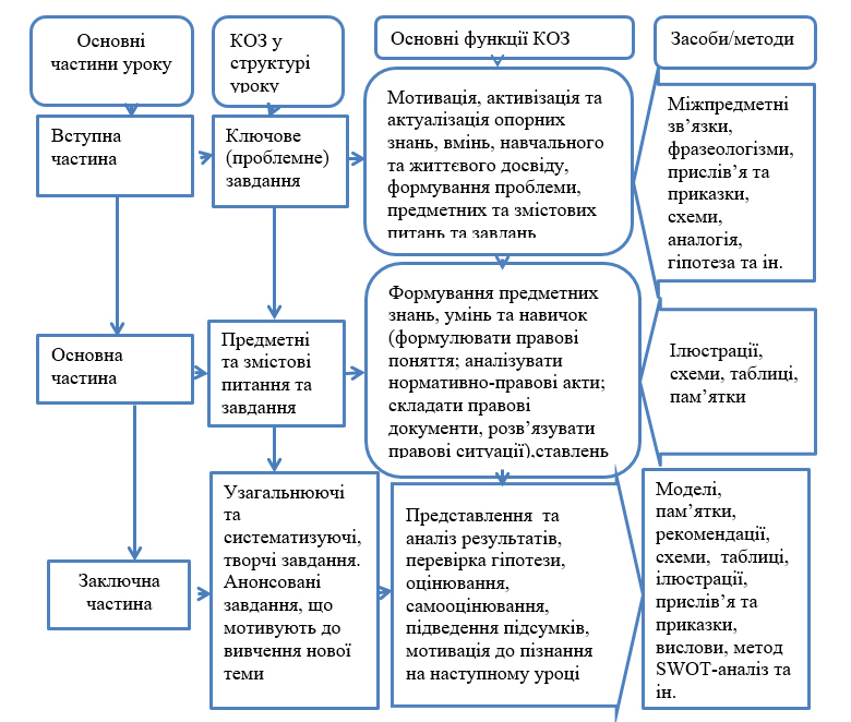 Правова предметна компетентність формується під час уроку за допомогою КОЗ, які в структурі уроку виконують низку функцій:
