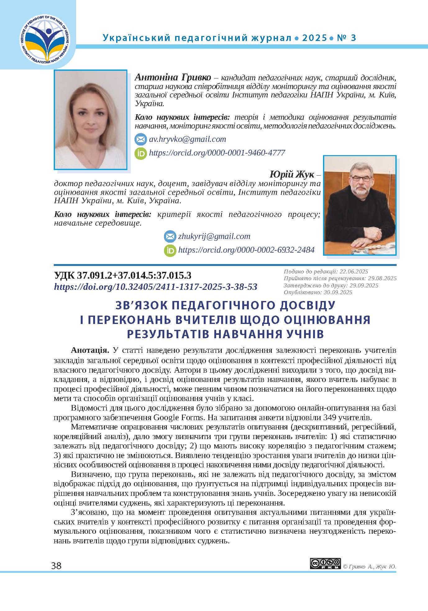 У статті наведено результати дослідження залежності переконань учителів закладів загальної середньої освіти про оцінювання в контексті професійної діяльності від педагогічного досвіду вчителя. Автори в цьому дослідженні виходили з того, що досвід викладання, а відповідно, і досвід оцінювання результатів навчання, який вчитель здобуває в процесі своєї професійної діяльності, може певним чином позначатися на його переконаннях щодо мети та способів організації оцінювання учнів у класі. Відомості для цього дослідження були зібрані за допомогою онлайн-опитування на базі програмного забезпечення Google Forms. На запитання анкети відповіли 349 учителів. Математичне опрацювання числових результатів опитування (дескриптивний, регресійний, кореляційний аналіз), дало змогу визначити три групи переконань вчителів: 1) які статистично залежать від педагогічного досвіду, 2) які мають високу кореляцію з педагогічним стажем та 3) які практично не змінюються. Виявлено тенденцію зростання уваги вчителів до низки ціннісних особливостей оцінювання в процесі накопичення ними досвіду педагогічної діяльності. Визначено, що група переконань, які не залежать від педагогічного досвіду, за змістом відображує підхід до оцінювання, що ґрунтується на підтримці індивідуальних процесів вирішення навчальних проблем та конструювання знань учнів. Зосереджено увагу на невисокій оцінці вчителями суджень, які характеризують ці переконання. З’ясовано, що актуальними питаннями для українських вчителів у контексті професійного розвитку на момент проведення опитування є питання організації та проведення формувального оцінювання, показником чого є статистично визначена неузгодженість переконань вчителів щодо групи відповідних суджень. Актуальність цього дослідження пов'язана з проблемою «старіння» учительських кадрів в Україні та може певною мірою відповісти на запитання, як це позначається на організації освітнього процесу загальної середньої освіти, невіддільним елементом якого є оцінювання учнів. Таке дослідження проведено вперше. Подальші дослідження можуть бути спрямовані на вивчення інших чинників, які впливають на формування переконань вчителів щодо оцінювання результатів навчання учнів.Посилання