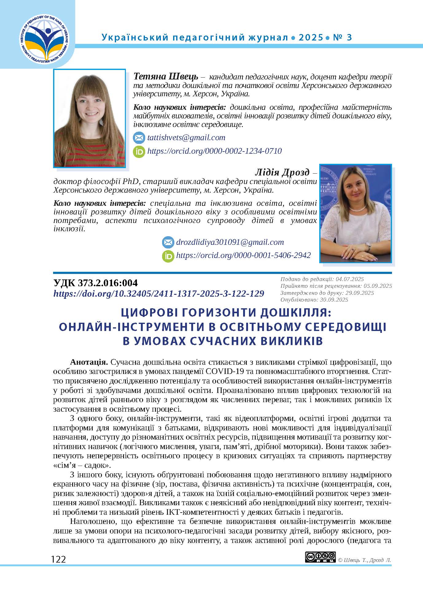 Сучасна дошкільна освіта стикається з викликами стрімкої цифровізації, що особливо загострилися в умовах пандемії COVID-19 та повномасштабного вторгнення. Ця стаття присвячена дослідженню потенціалу та особливостей використання онлайн-інструментів у роботі зі здобувачами дошкільної освіти. Вона аналізує вплив цифрових технологій на розвиток дітей раннього віку, розглядаючи як численні переваги, так і можливі ризики їх застосування в освітньому процесі.