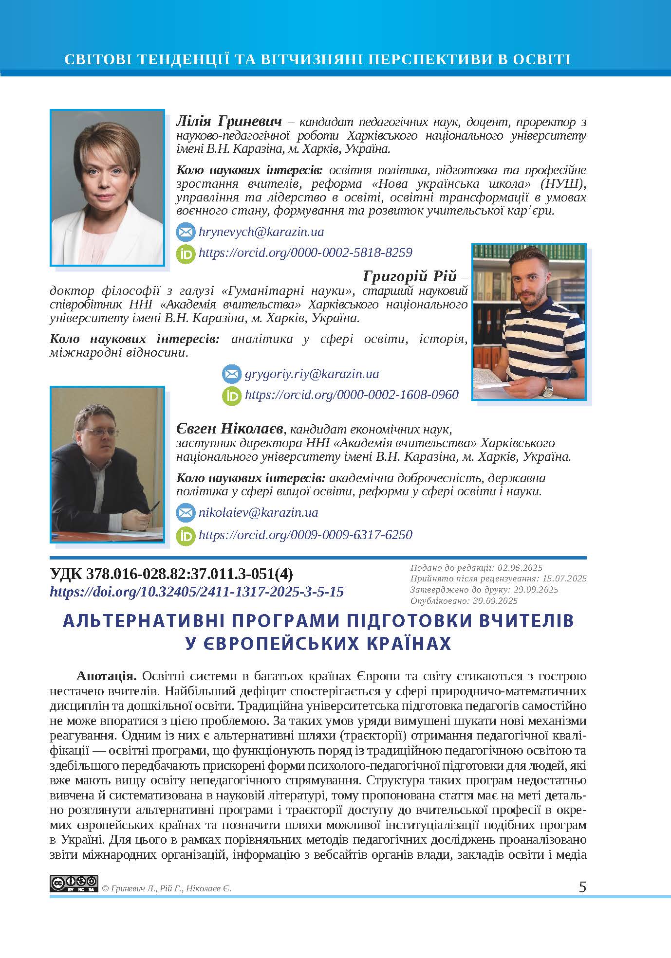 Гриневич, Л., Рій, Г., & Ніколаєв, Є. (2025). АЛЬТЕРНАТИВНІ ПРОГРАМИ ПІДГОТОВКИ ВЧИТЕЛІВ У ЄВРОПЕЙСЬКИХ КРАЇНАХ. Український Педагогічний журнал, (3), 5–15. https://doi.org/10.32405/2411-1317-2025-3-5-15