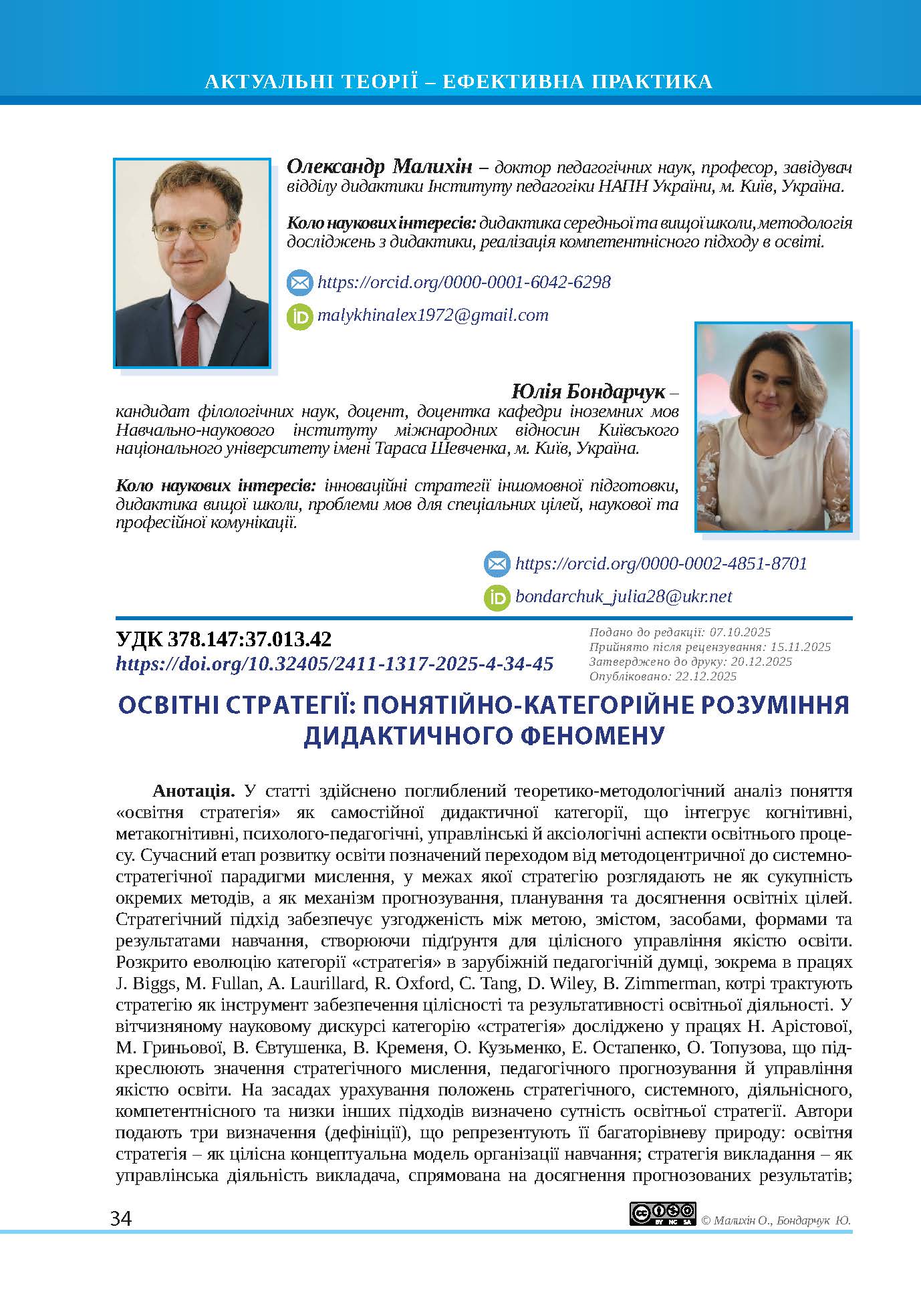 У статті здійснено поглиблений теоретико-методологічний аналіз поняття «освітня стратегія» як самостійної дидактичної категорії, що інтегрує когнітивні, метакогнітивні, психолого-педагогічні, управлінські й аксіологічні аспекти освітнього процесу. Сучасний етап розвитку освіти позначений переходом від методоцентричної до системно-стратегічної парадигми мислення, у межах якої стратегію розглядають не як сукупність окремих методів, а як механізм прогнозування, планування та досягнення освітніх цілей. Стратегічний підхід забезпечує узгодженість між метою, змістом, засобами, формами та результатами навчання, створюючи підґрунтя для цілісного управління якістю освіти. Розкрито еволюцію категорії «стратегія» в зарубіжній педагогічній думці, зокрема в працях J. Biggs, M. Fullan, A. Laurillard, R. Oxford, C. Tang, D. Wiley, B. Zimmerman, котрі трактують стратегію як інструмент забезпечення цілісності та результативності освітньої діяльності. У вітчизняному науковому дискурсі категорію «стратегія» досліджено у працях Н. Арістової, М. Гриньової, В. Євтушенка, В. Кременя, О. Кузьменко, Е. Остапенко, О. Топузова, що підкреслюють значення стратегічного мислення, педагогічного прогнозування й управління якістю освіти. На засадах урахування положень стратегічного, системного, діяльнісного, компетентнісного та низки інших підходів визначено сутність освітньої стратегії. Автори подають три визначення (дефініції), що репрезентують її багаторівневу природу: освітня стратегія – як цілісна концептуальна модель організації навчання; стратегія викладання – як управлінська діяльність викладача, спрямована на досягнення прогнозованих результатів; що введення поняття «стратегія» до понятійно-категорійного апарату сучасної дидактики сприяє подоланню методологічної фрагментарності, формує основу для розроблення інноваційних моделей навчання, орієнтованих на стратегічну культуру мислення, саморегуляцію, суб’єктність і партнерство між викладачем і здобувачем освіти. Стратегічний підхід є необхідною умовою забезпечення сталості, гнучкості й адаптивності освіти загалом та освітнього процесу під час її здобуття в умовах цифровізації, глобальної мобільності та євроінтеграційних змін в Україні. Перспективи подальших досліджень полягають у створенні типології освітніх стратегій, розробленні моделей стратегічного управління освітніми (навчальними) процесами й інтеграції стратегічного підходу до цифрової, змішаної та інклюзивної освіти, орієнтованої на стандарти сталого розвитку й академічної доброчесності.