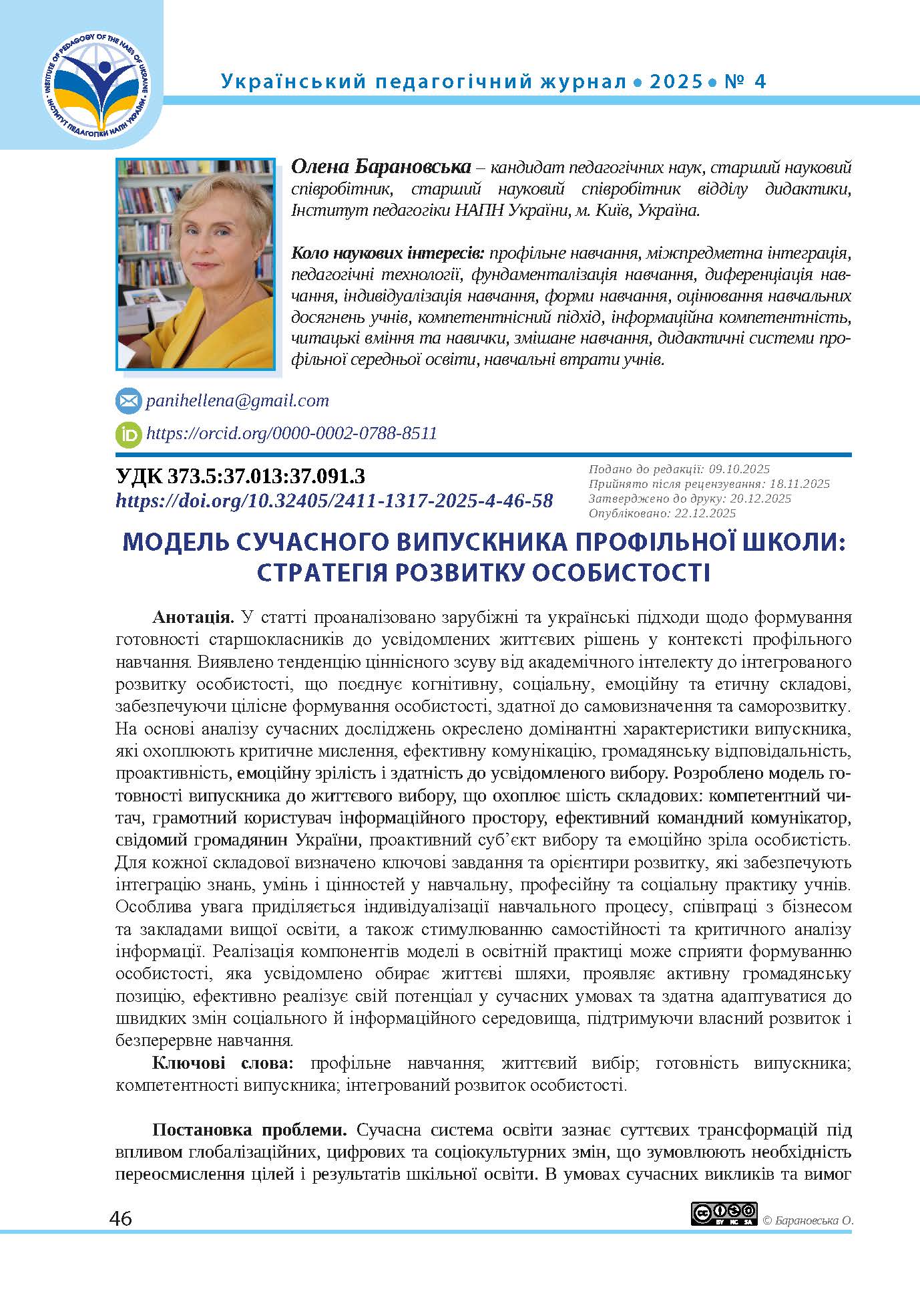 Барановська, О. (2025). МОДЕЛЬ СУЧАСНОГО ВИПУСКНИКА ПРОФІЛЬНОЇ ШКОЛИ: СТРАТЕГІЯ РОЗВИТКУ ОСОБИСТОСТІ. Український Педагогічний журнал, (4), 46–58. https://doi.org/10.32405/2411-1317-2025-4-46-58