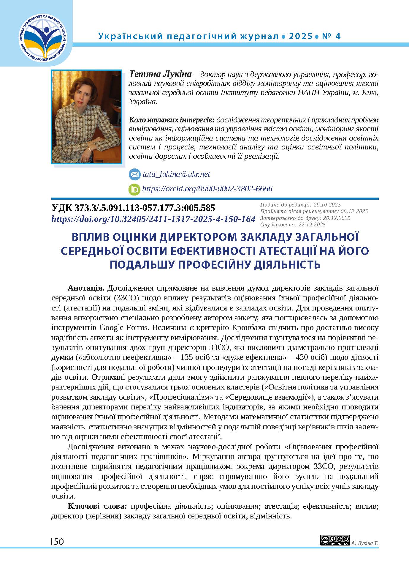 Лукіна, Т. (2025). ВПЛИВ ОЦІНКИ ДИРЕКТОРОМ ЗАКЛАДУ ЗАГАЛЬНОЇ СЕРЕДНЬОЇ ОСВІТИ ЕФЕКТИВНОСТІ АТЕСТАЦІЇ НА ЙОГО ПОДАЛЬШУ ПРОФЕСІЙНУ ДІЯЛЬНІСТЬ. Український Педагогічний журнал, (4), 150–164. https://doi.org/10.32405/2411-1317-2025-4-150-164