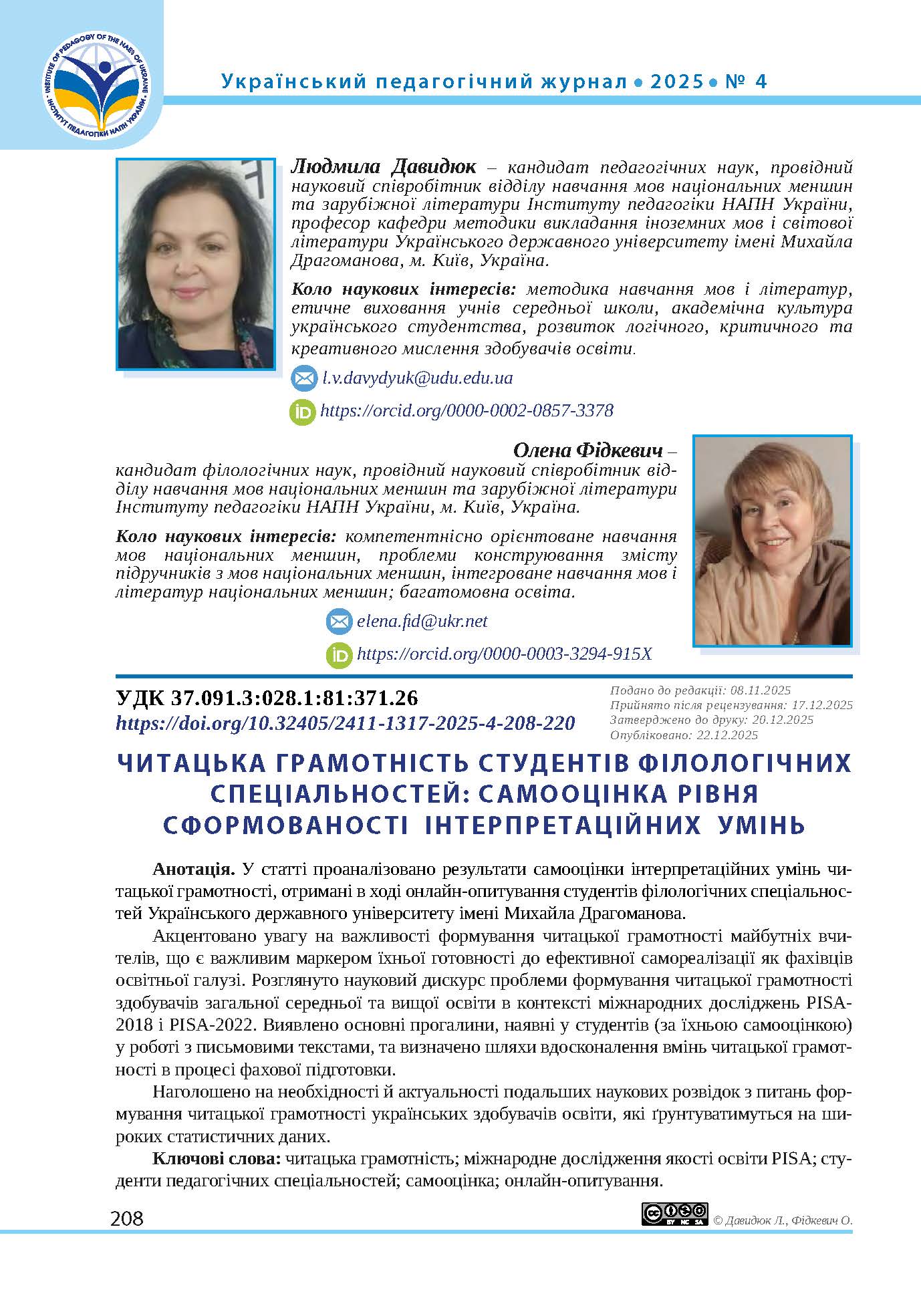 Fidkevych, O. L. (2024). Shchodo pytannia zmistu poniat «chytannia z rozuminniam» ta «chytatska hramotnist». In Kompetentnisno oriientovane navchannia: vyklyky ta perspektyvy: zbirnyk tez IV Vseukrainskoi naukovo-praktychnoi internet-konferentsii, pp. 99-102. Kyiv: Osvita (in Ukrainian).