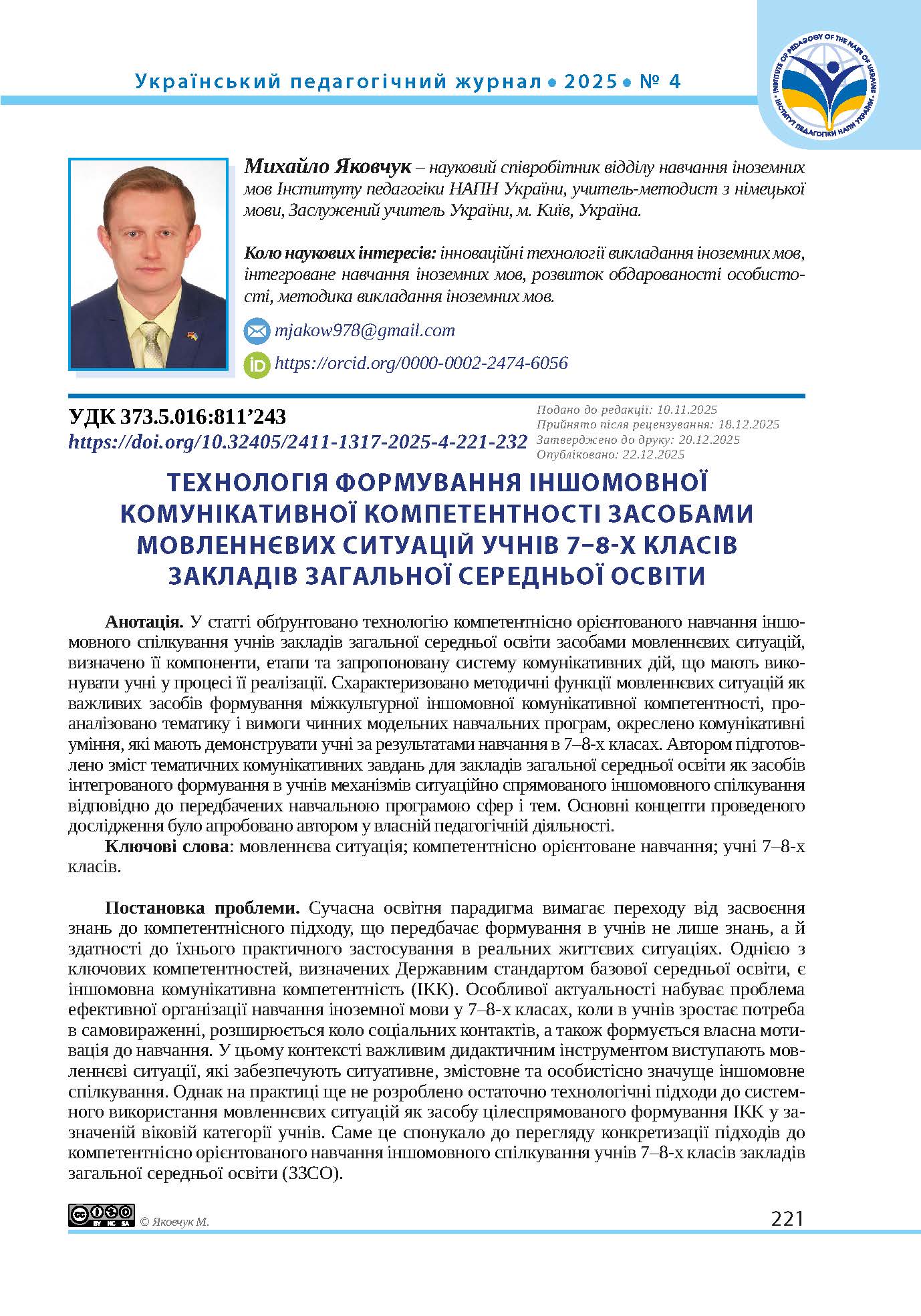 У статті обґрунтовано технологію компетентнісно орієнтованого навчання іншомовного спілкування учнів закладів загальної середньої освіти засобами мовленнєвих ситуацій, визначено її компоненти, етапи та запропоновану систему комунікативних дій, що мають виконувати учні у процесі її реалізації. Схарактеризовано методичні функції мовленнєвих ситуацій як важливих засобів формування міжкультурної іншомовної комунікативної компетентності, проаналізовано тематику і вимоги чинних модельних навчальних програм, окреслено комунікативні уміння, які мають демонструвати учні за результатами навчання в 7–8-х класах. Автором підготовлено зміст тематичних комунікативних завдань для закладів загальної середньої освіти як засобів інтегрованого формування в учнів механізмів ситуаційно спрямованого іншомовного спілкування відповідно до передбачених навчальною програмою сфер і тем. Основні концепти проведеного дослідження було апробовано автором у власній педагогічній діяльності.